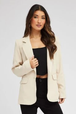 Beige Jacket Long Sleeve Collar Neck