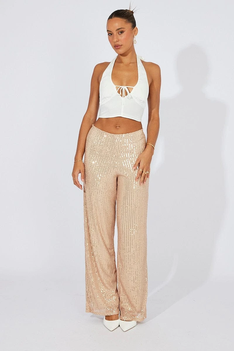 Beige Wide Leg Pants High Rise Sequin