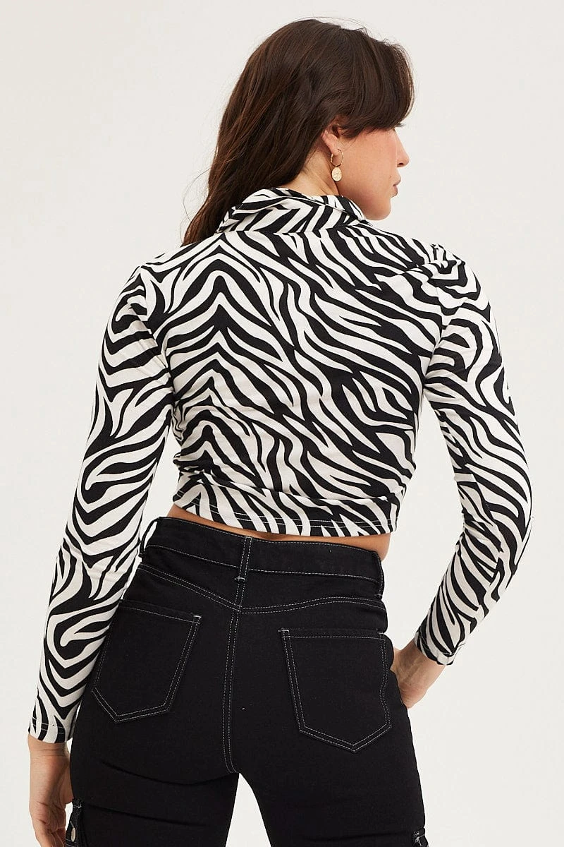 Features: Animal Print, Cropped, Ruched Detail, Collared