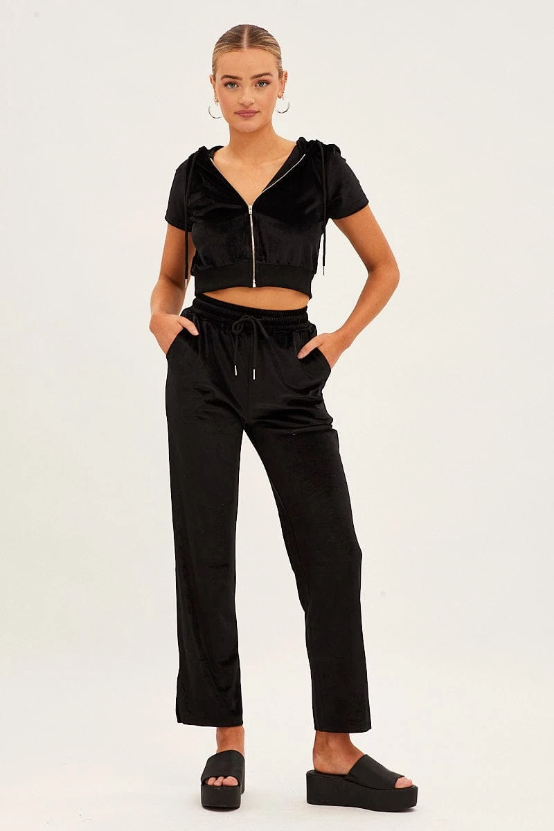 Black Velour Short Sleeve Zip Lounge Hoodie