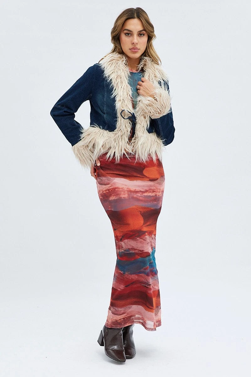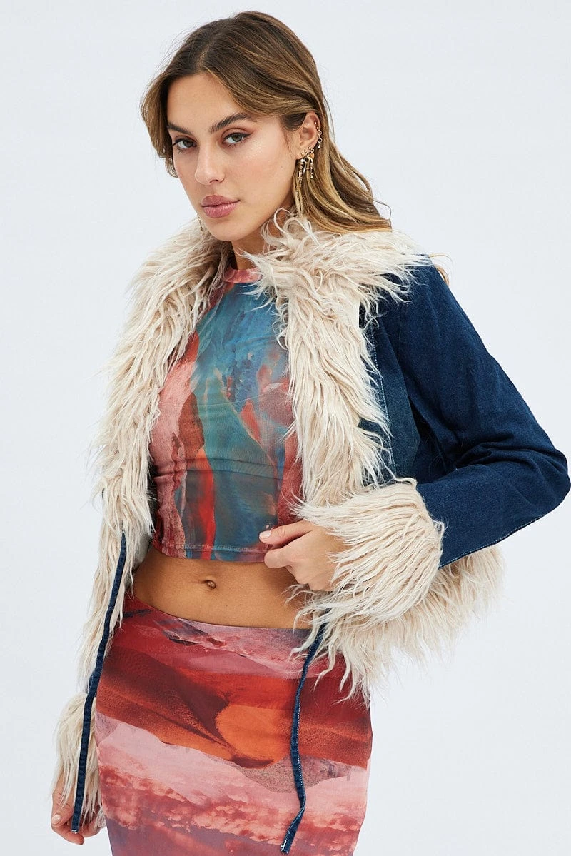 Denim Jacket Long Sleeve Faux Fur Tie Front Washed Denim
