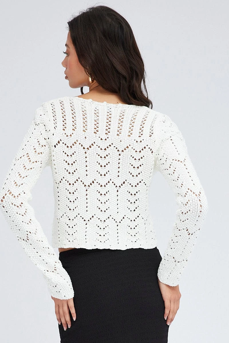White Round Neck Long Sleeve Crochet Knit Cardigan